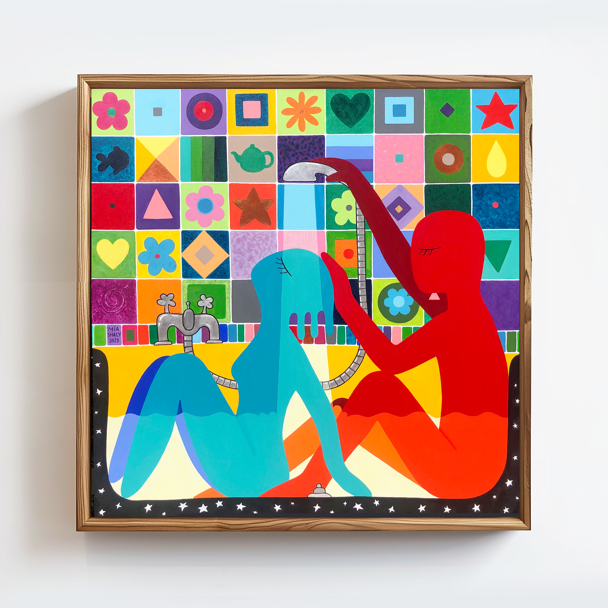 On the tiles in the background, I’ve included symbols that are important to me, such as a teapot, a heart, flowers, birds, and geometric shapes, adding personal meaning to the scene.