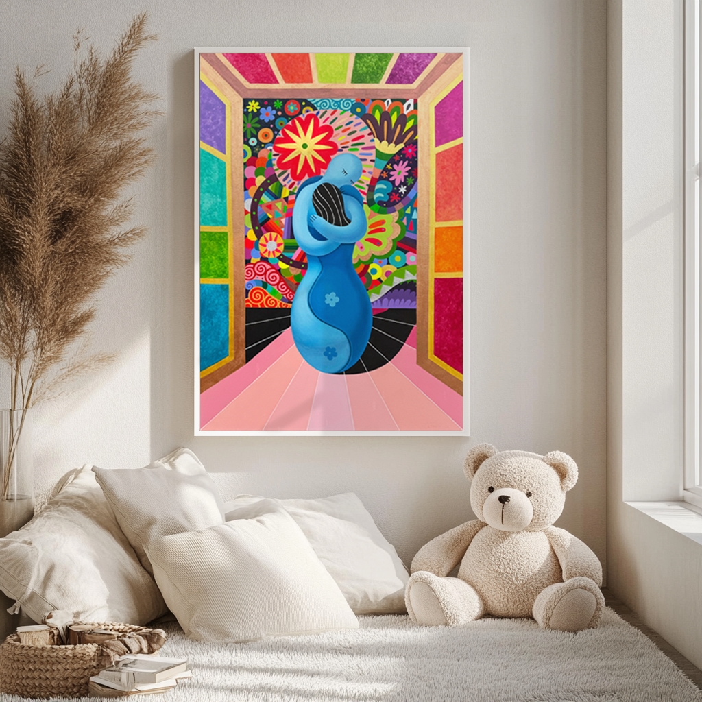 The two figures, united in an embrace, represent harmony and the yin and yang of love. This moment symbolizes the importance of feeling truly welcomed and cherished, especially when we return home, where we can finally rest and feel loved.